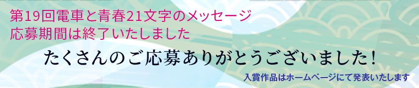 ニュース 第19回青春21文字もメッセージ募集締め切りました 2025年9月24日 seisyun21 https://densyatoseisyun21.com/wp/wp-content/uploads/2021/06/logo.png 青春21文字のメッセージ