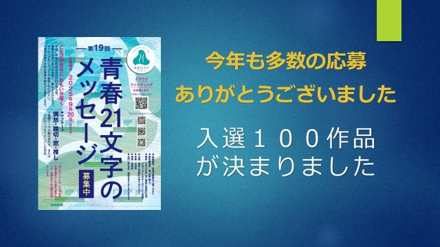 ニュース 入選100作品が決まりました 2025年11月14日 seisyun21 https://densyatoseisyun21.com/wp/wp-content/uploads/2021/06/logo.png 青春21文字のメッセージ